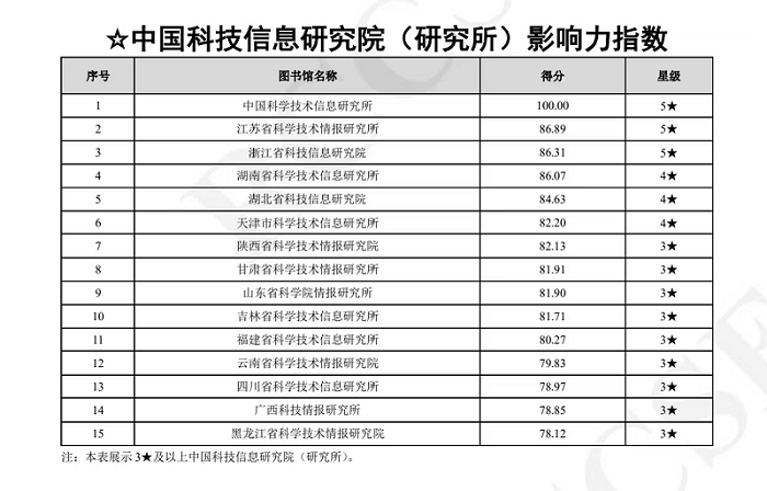 近日,《数智时代中国图书馆影响力指数报告(2025)》发布,省科学技术信息研究所在“中国科技信息研究院(研究所)类影响力指数”中排名第10位,在“专业图书馆学术影响力百强”中排名第17位,在全国地方科技信息研究所中位列第4位。